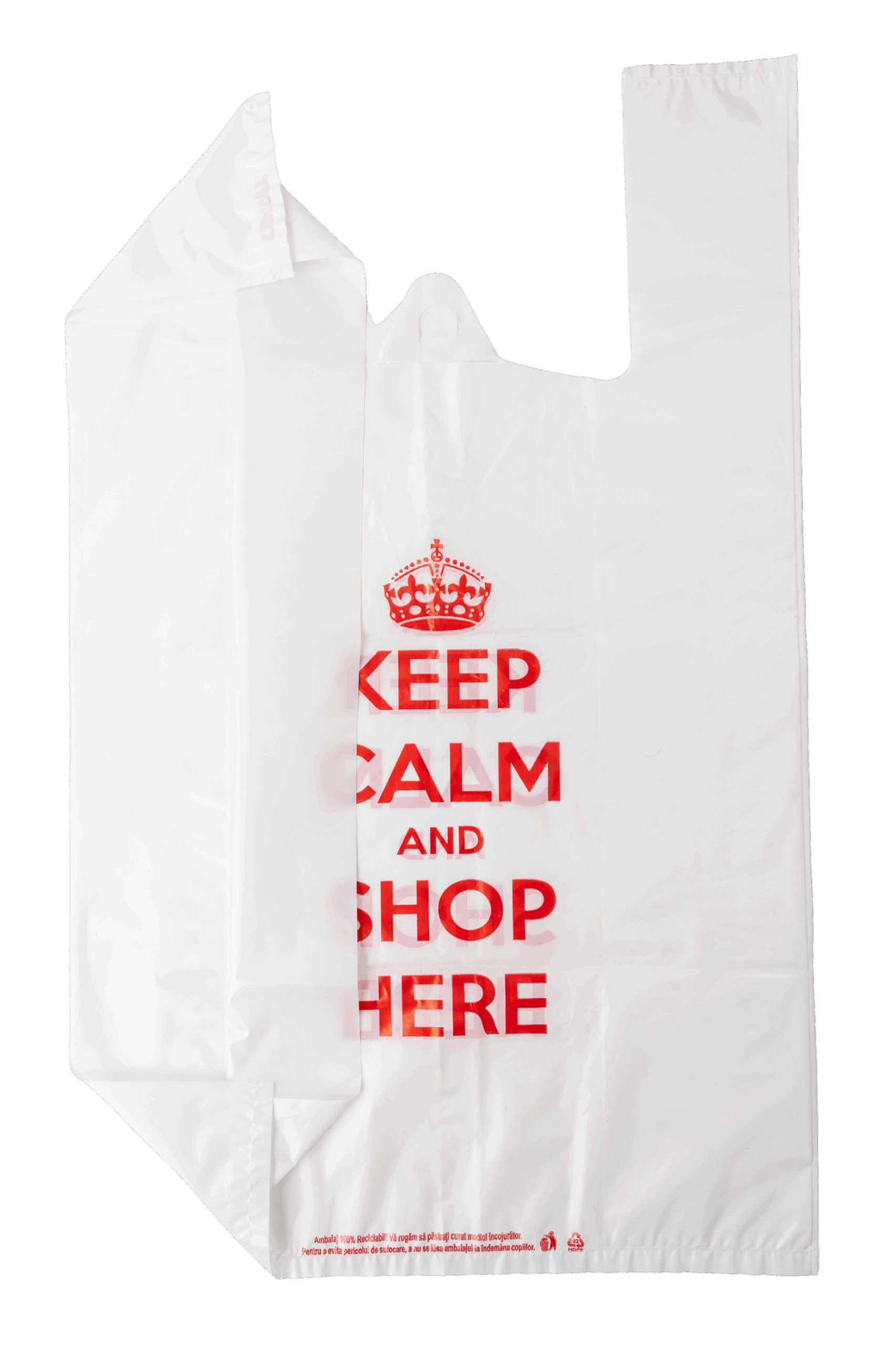 Adaugă în coș Sacosa din polietilenă tip maiou 35 cm x 15 cm x 60 cm – Design „Keep Calm and Shop Here”, set 50 bucati33,37 lei